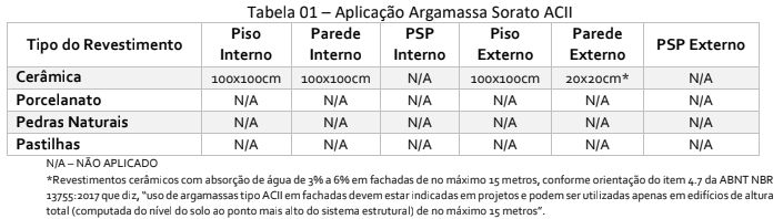 É indicada no assentamento de placas cerâmicas para revestimentos interno e externo. Não é recomendada para assentamentos de porcelanato, mármore, pastilhas de vidro, porcelana e cerâmica sobre cerâmica, para essas situações, temos outros modelos de argamassa Sorato para atender.